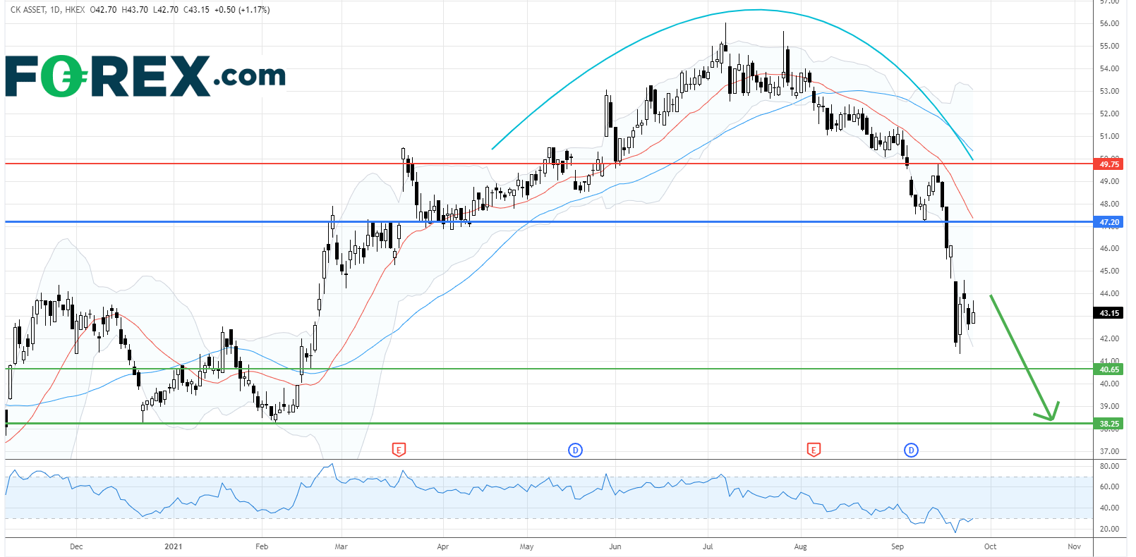 在日线图上,股价跌穿了颈线并确认圆顶的形态。目前,股价呈现一浪低于一浪的形态。相对强弱指数亦指出强劲的下行动力。