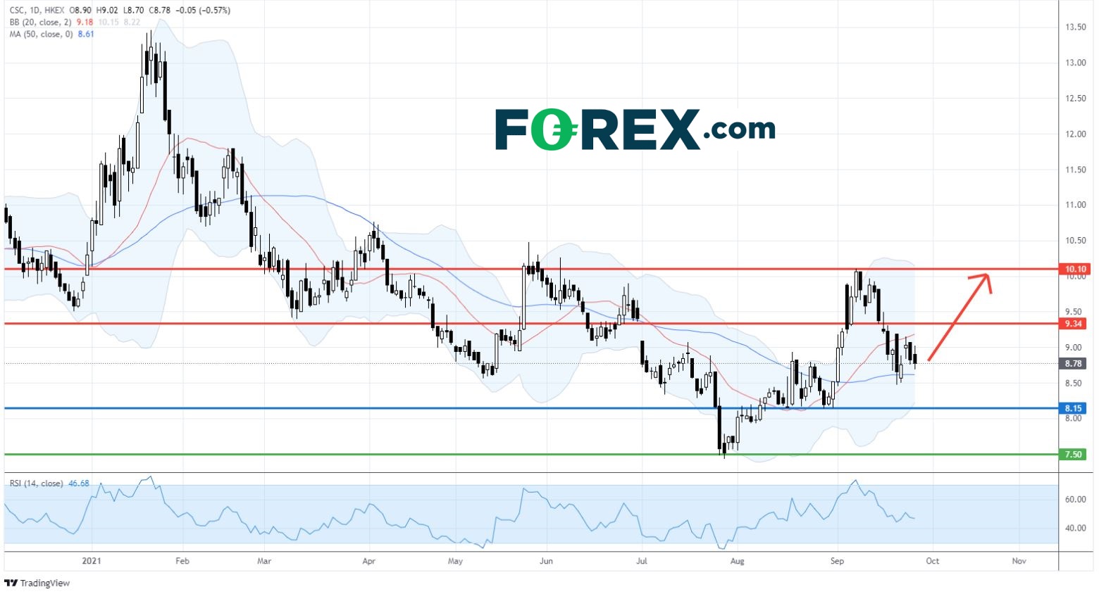 相反,若股价跌穿8.15港元水平,将确认短期反转看跌,另一道下方支持水平在7.50港元(7月尾低位)。