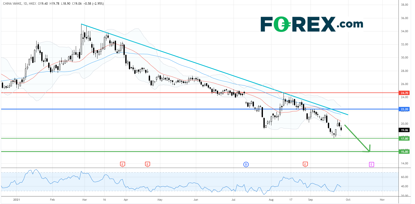 内地房地产发展商龙头 万科企业 (2202.HK) 由今年2月高位已经下跌超过穿过4成。目前,整个内地房地产股票板块均受恒大地产 (3333.HK) 的债务危机所拖累。