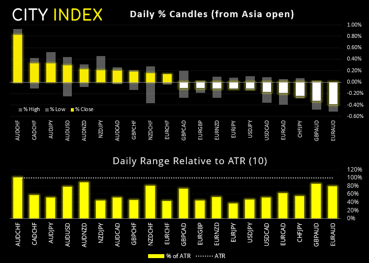 商品货币跟随着亚洲股市走高,录得隔夜最强劲表现。澳元兑美元上涨约0.45%,纽元上涨0.38%,加元兑美元上涨约0.18%。瑞郎和美元是目前走势最弱的主要货币。