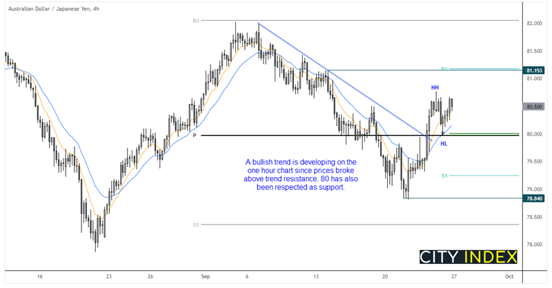 澳元/日元小时图正在形成一个看涨趋势,汇价沿着10和20K均线反弹。自探入78.84低点以来,货币对已两次低点和高点抬高,在升穿80之后守住该水平支撑位,月图和周图枢纽也落在该水平。鉴于整个股市情绪积极,我们认为汇价或尝试拿下81,并可能测试周图一号阻力枢纽点附近的81.15高点。