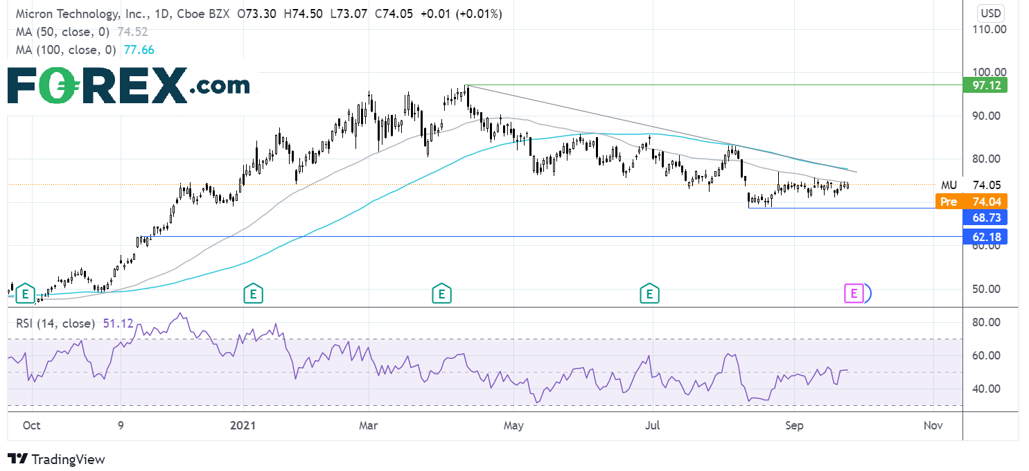 股价交投于下降趋势线和日线图50/100均线之下,不过8月于当月低点69美元获撑。