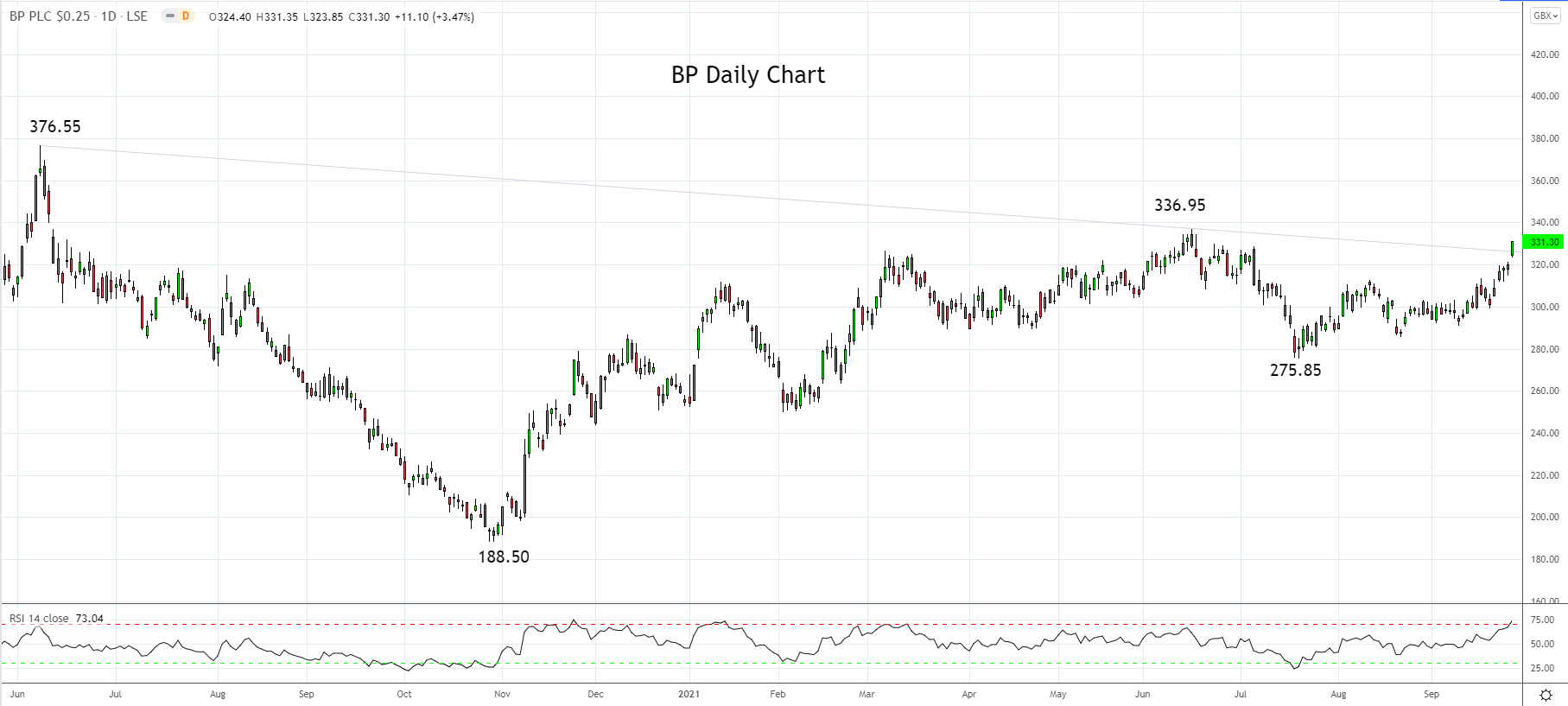 BP很可能测试并升穿今年迄今高点336.95英镑,并有望向下一阻力位350英镑发起进攻。