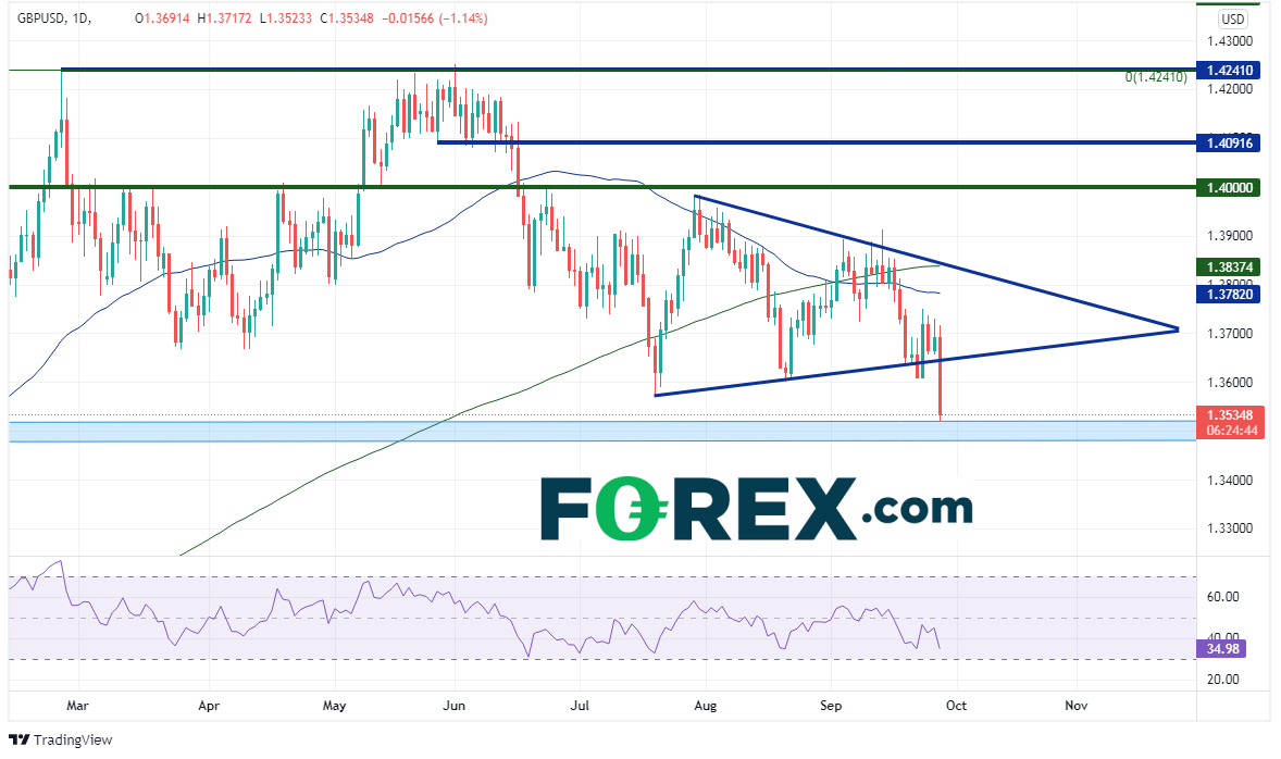 英镑/美元日图已自对称三角形下破,正逼近上文提到的周图支撑位。上方阻力在9月22日低点1.3609,然后是对称三角形的上升趋势线,即1.3650附近。如果站于其上,上看周二高点1.3717。