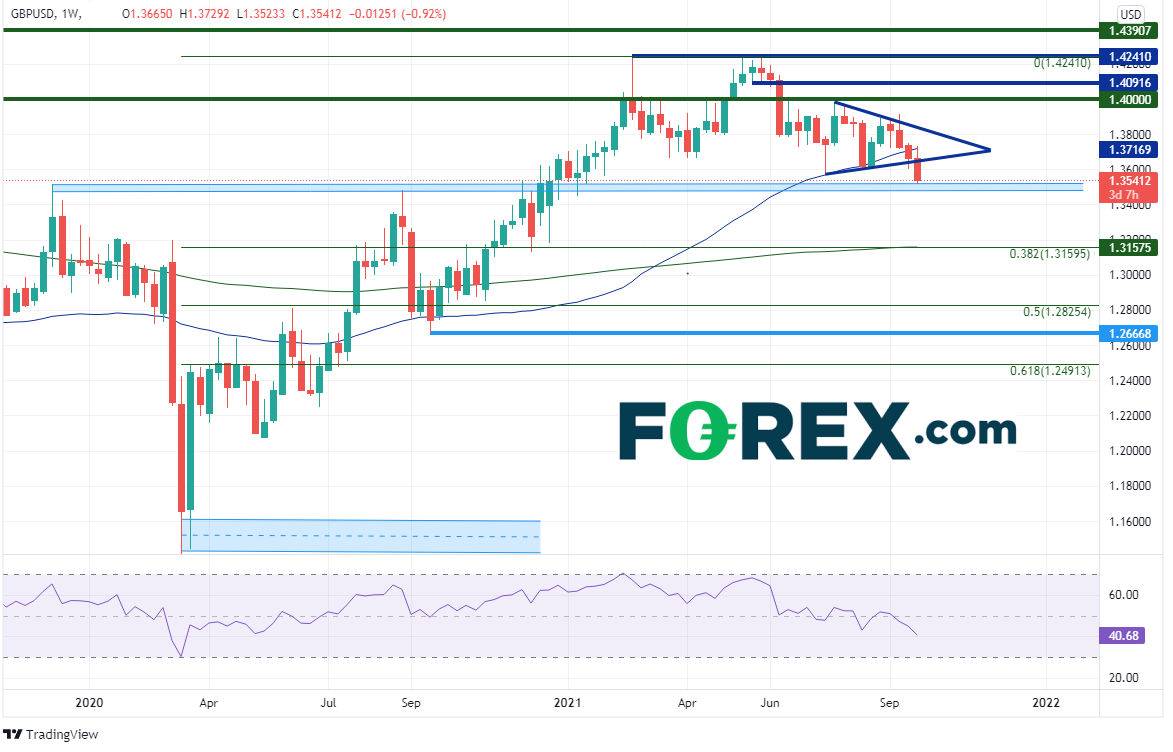 英镑/美元周图跌至1月以来最低点,跌势堪堪止步于2019年12月以来的水平支撑位,即1.35149附近。该位下方一直到1.3483构成支撑带,如若失守,可能跌至2020年3月低点到2月高点行情的38.2%回档位,即1.3159附近。200周均线同样落在附近的1.3157。