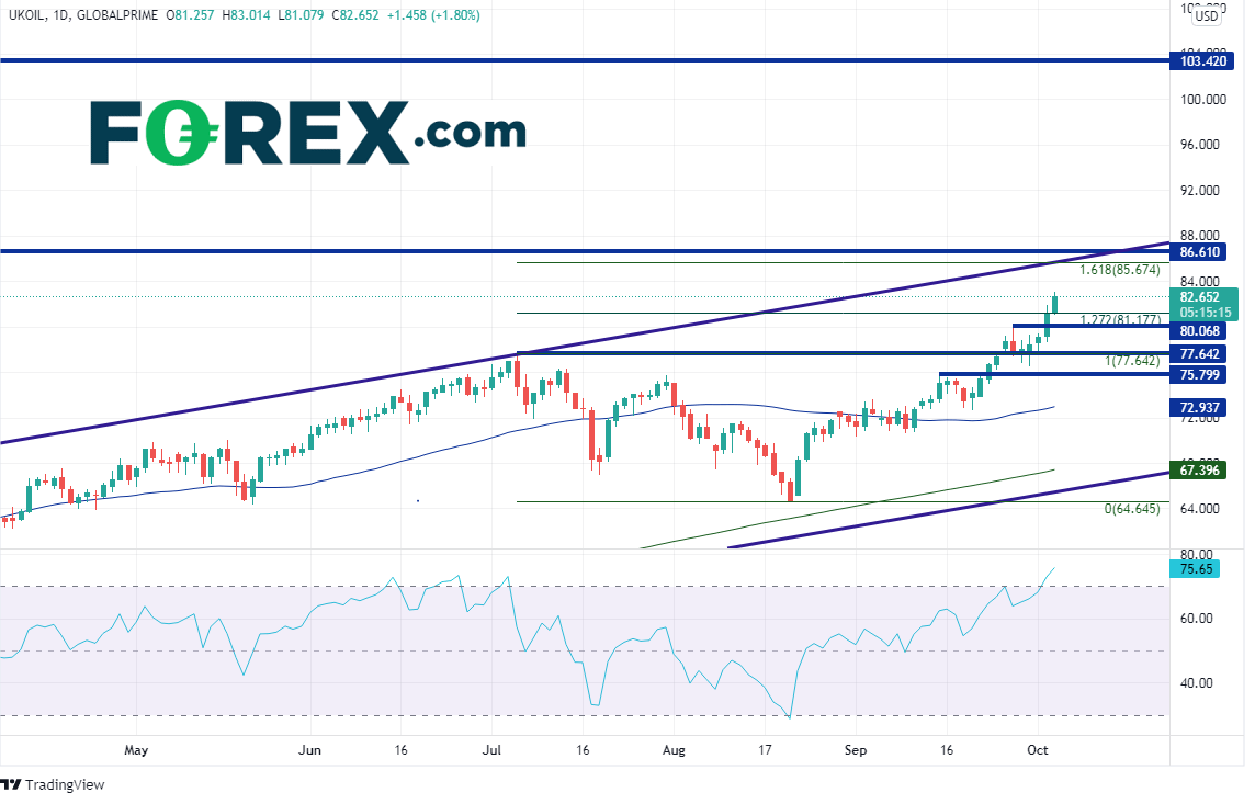 随着油价飚升,通胀上涨也就不出奇了。请注意,西得州原油价格9月上涨超过9.5%,10月前两个交易日上涨近5.25%。早些时候发布的东京CPI显示,9月CPI年率上涨0.3%,前值为下降0.4%。该指标通常指示日本整体通胀情况,而9月涨幅中的大部分来自能源和食品价格上涨,也是2020年7月以来读数首次超过0%。通胀上升是全球现象,上周公布的欧洲通胀数据显示,通胀年率从3%的前值上升至3.4%。