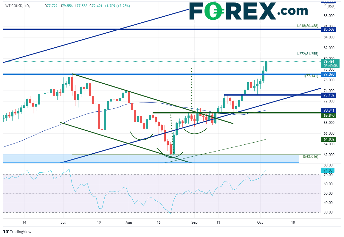 布伦特原油的走势图和西得州原油看起来很像,双双交投于年内新高,但前者不同于后者的是其在2018年10月就创下新高86.61,该位之下的阻力在7月6日高点到8月20日低点行情的161.8%扩展位85.67附近,而2020年4月以来的上斜趋势线也在该位附近。如果站上161.8%扩展位,则有摸至103.42附近的2013年11月低点的空间。请注意,和西得州原油一样,布伦特原油的RSI也处于超买区域,暗示其可能准备回调。第一支撑位在9月28日以来高点80.06附近。