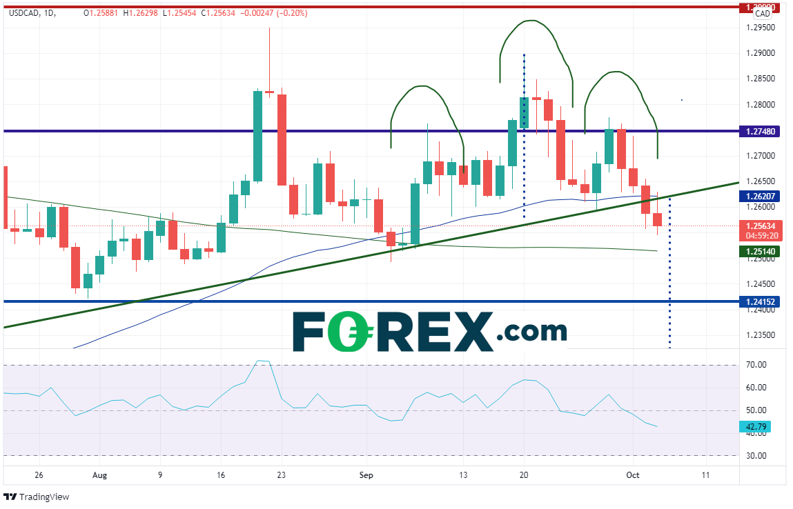 8月19日到8月23日期间,美元/加元形成黄昏之星反转K线形态。价格也确实在9月3日从1.2949高点回撤至7月5日以来的趋势线支撑位1.2493,随后反弹但未能攻克8月20日高点,最终形成头肩顶形态。价格于周一突破1.2600附近的颈线。过去4天随着油价上涨,美元/加元一直走弱。头肩顶形态的目标在颈线突破位加上头部到颈线的长度。就美元/加元日图而言,该位在1.2295附近。