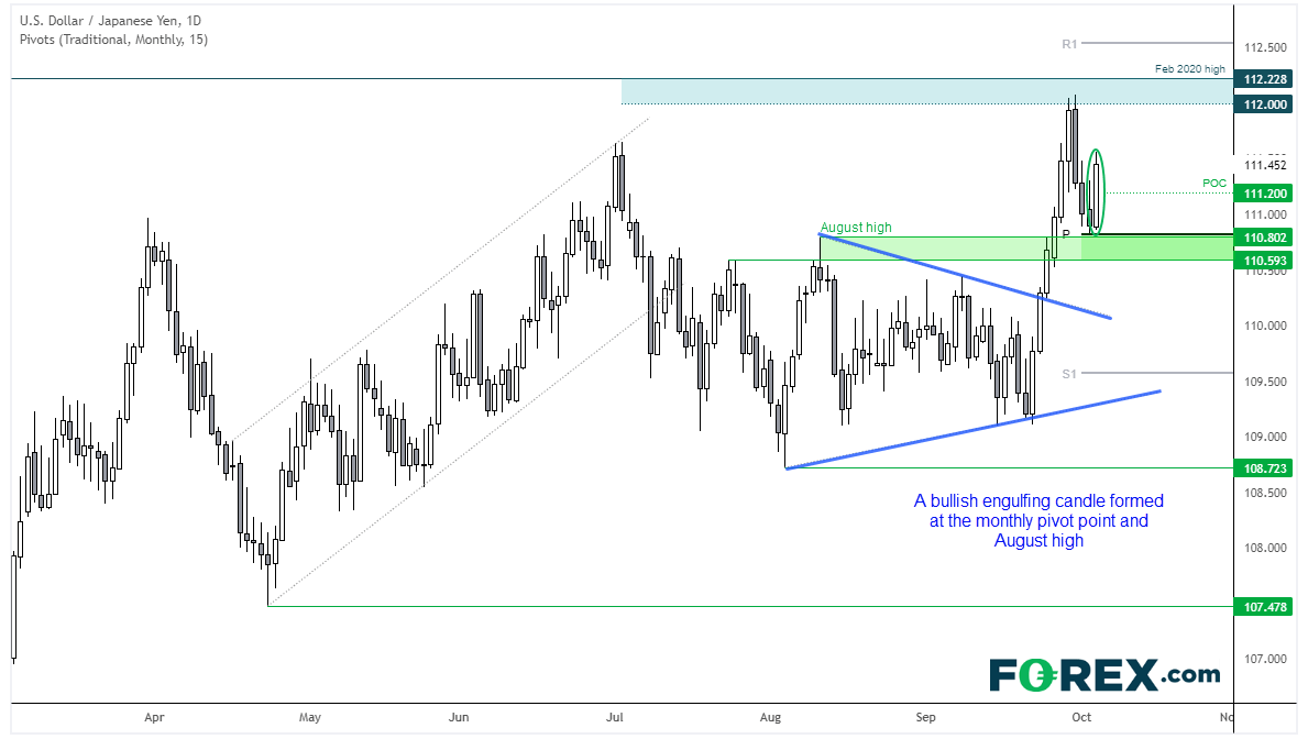 从价格走势来看,美元/日元值得关注。该货币对持续6天的上涨打破了三角形形态,现已回撤,并在月图枢轴点和8月高点处企稳,形成了看涨吞噬K线,表明多头重新掌握主动。所以,我们迫切地希望看到回撤局限于昨天K线范围内或者突破高点从而奠定看涨结构。111.20是昨天的控制点,可以像磁铁一样在价格回撤时构成支撑位。