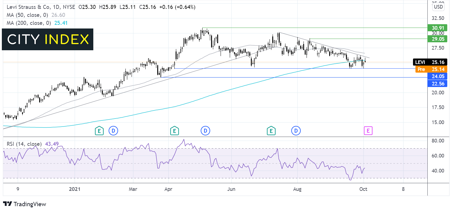 李维斯股价自7月中旬以来一直呈下降趋势。交投于日线图下降趋势线和50均线下方。