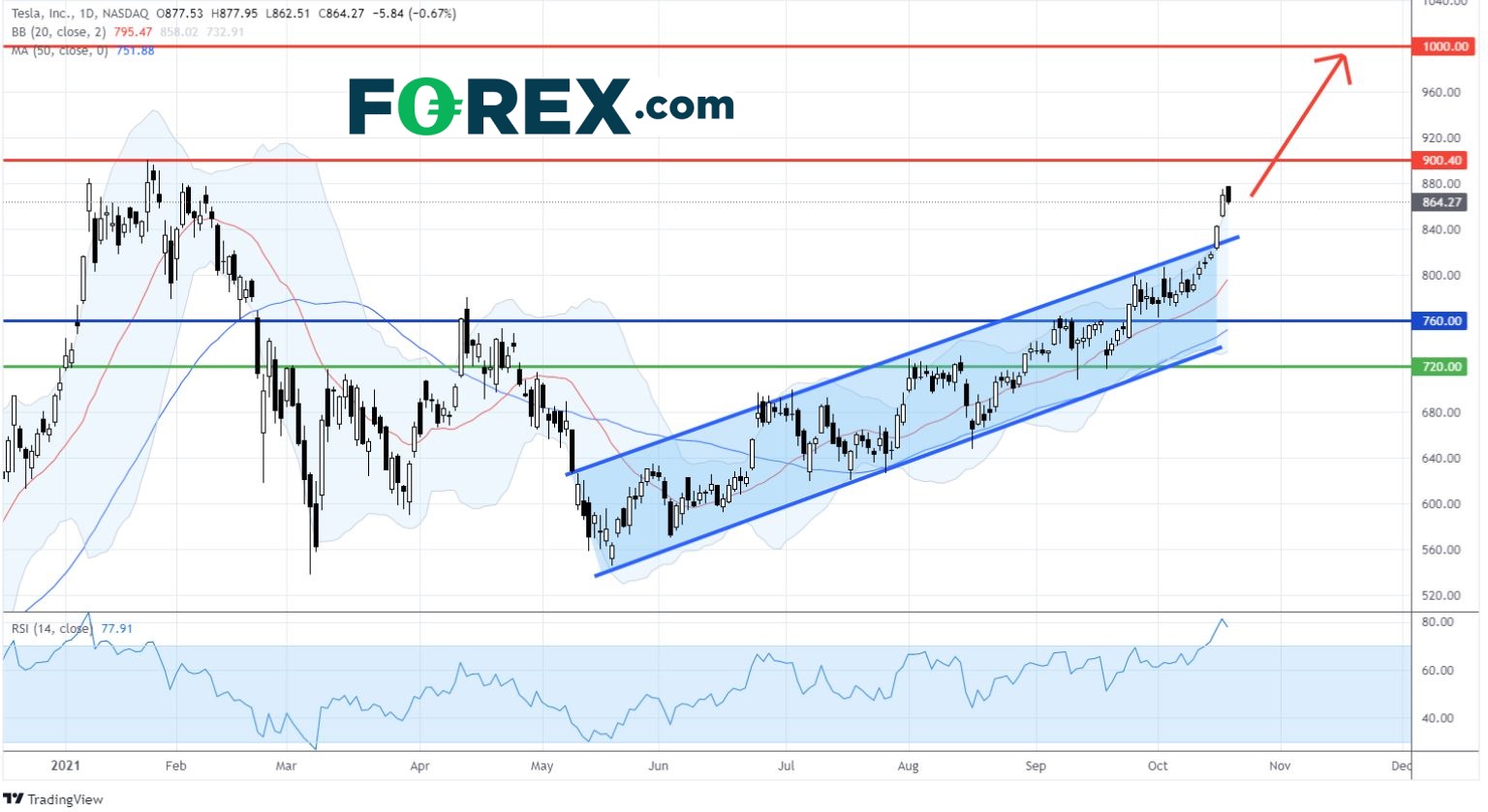 在日线图上,特斯拉的股价,已升破了我们不久之前所订的第一上行目标830.00美元,并向另一目标900.40美元 – 即见於1月底的历史高位 – 进发。