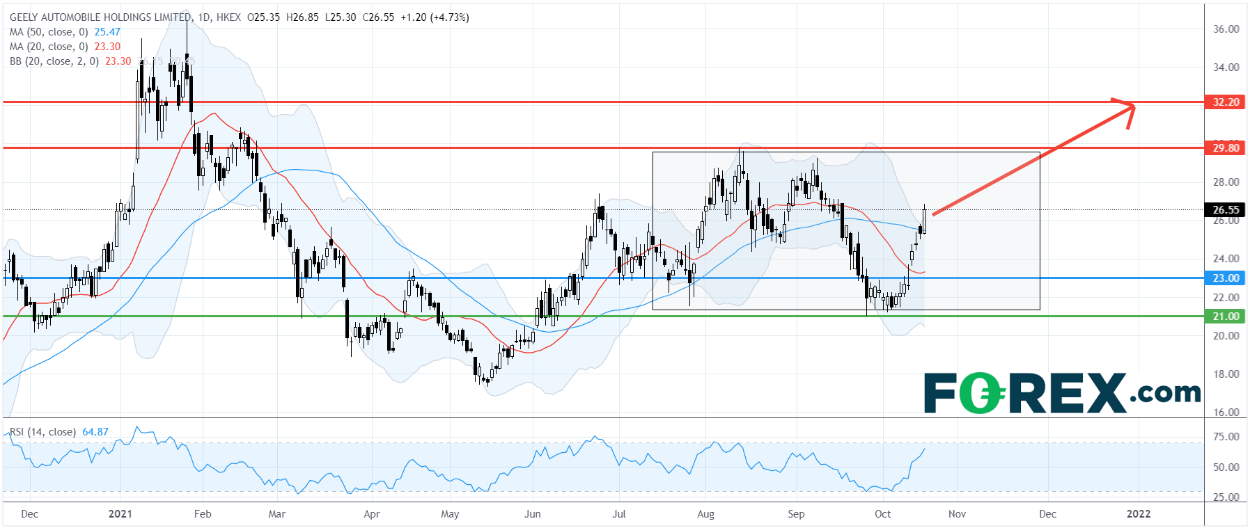 从技术角度看,如日线图所示,吉利走势已经呈现站稳迹象。它触及7月低点后已显着反弹,形成了一个短线的盘整区。