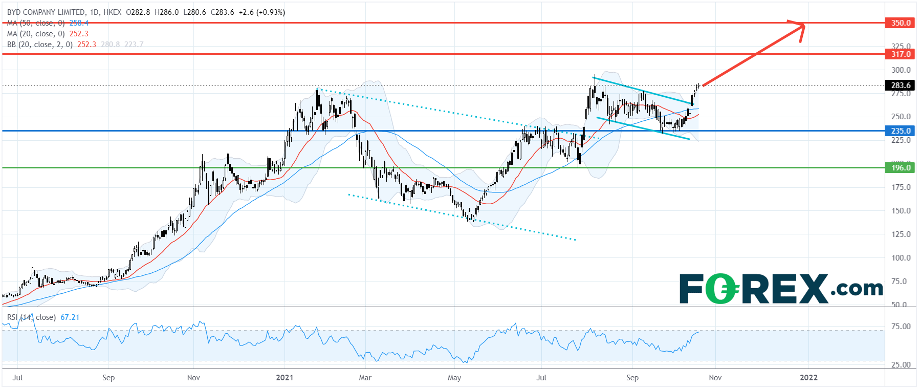 中国电动车生产厂 比亚迪 (港股编号 : 1211) 股价10月迄今涨超10%,完全收復9月的跌幅,今年迄今涨超30%。该公司今月初公佈,9月新能源汽车销量按年升258%至71,099辆,产量增长259%至71,115辆。