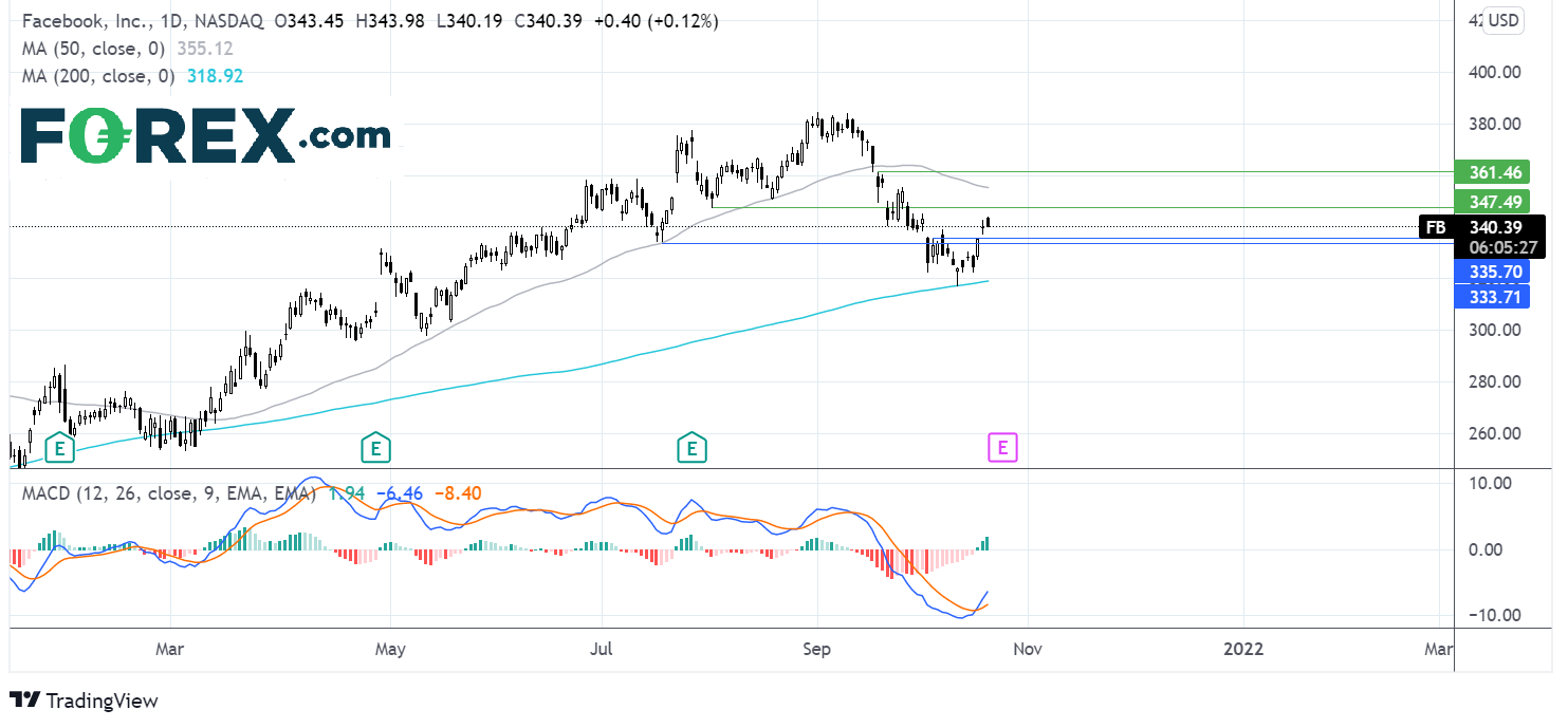 Facebook继续自其上周探入的200均线展开反弹。受升穿阻力位335美元和MACD指标金叉鼓舞,买盘对进一步上涨态度乐观。