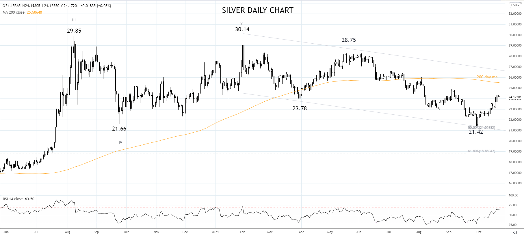只要白银守住23.00美元短线支撑以及21.45和21.00美元之间中期支撑位,我们保持看涨,并等待白银继续反弹攻向25.70美元(200天均线)和26.70美元(趋势通道阻力位)之间阻力层。