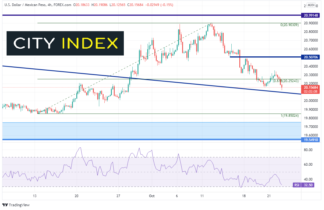 自2020年12月以来,美元/墨西哥比索一直守在19.5481和19.7464之间关键支撑区上方。每次汇价到达这一区域就会展开反弹,然后构筑高点降低。9月28日,美元/墨西哥比索终于升穿2020年6月30日以来下行趋势线。货币对交投于水平支撑位(现阻力位)略下方,目前落在20.2217和20.1000之间一个大型交汇区域,其中包括: