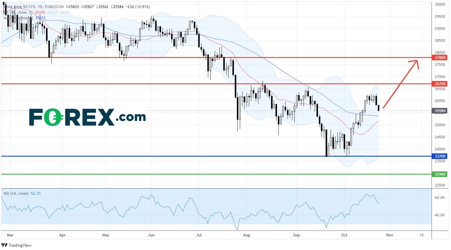 若港股恒生指数 CFD成功收盘於26,700点之上,可确认反弹延续,并向另一上行阻力位 (目标) 27,800点进发。