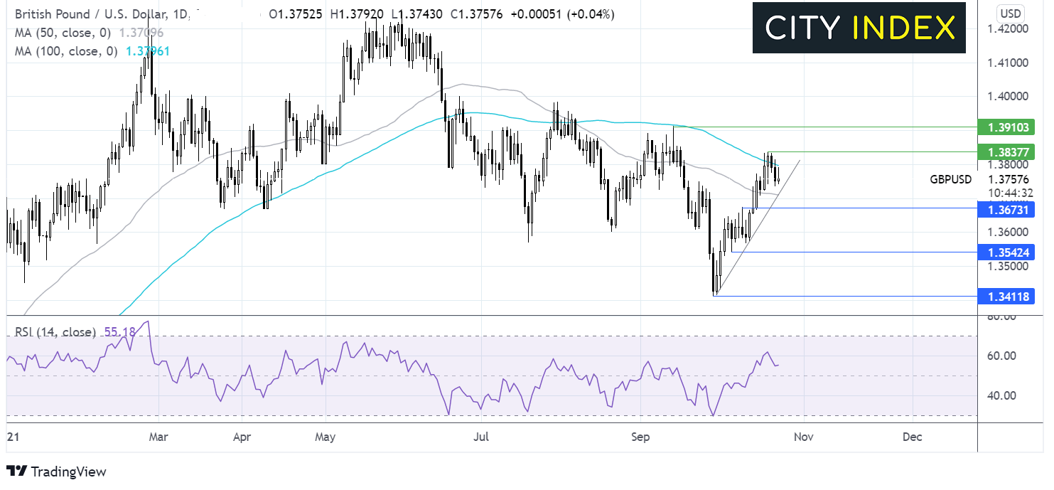 英镑/美元交投于50和100均线之间,但仍守在本月初急升的趋势线之上。RSI表明仍有进一步上行空间。