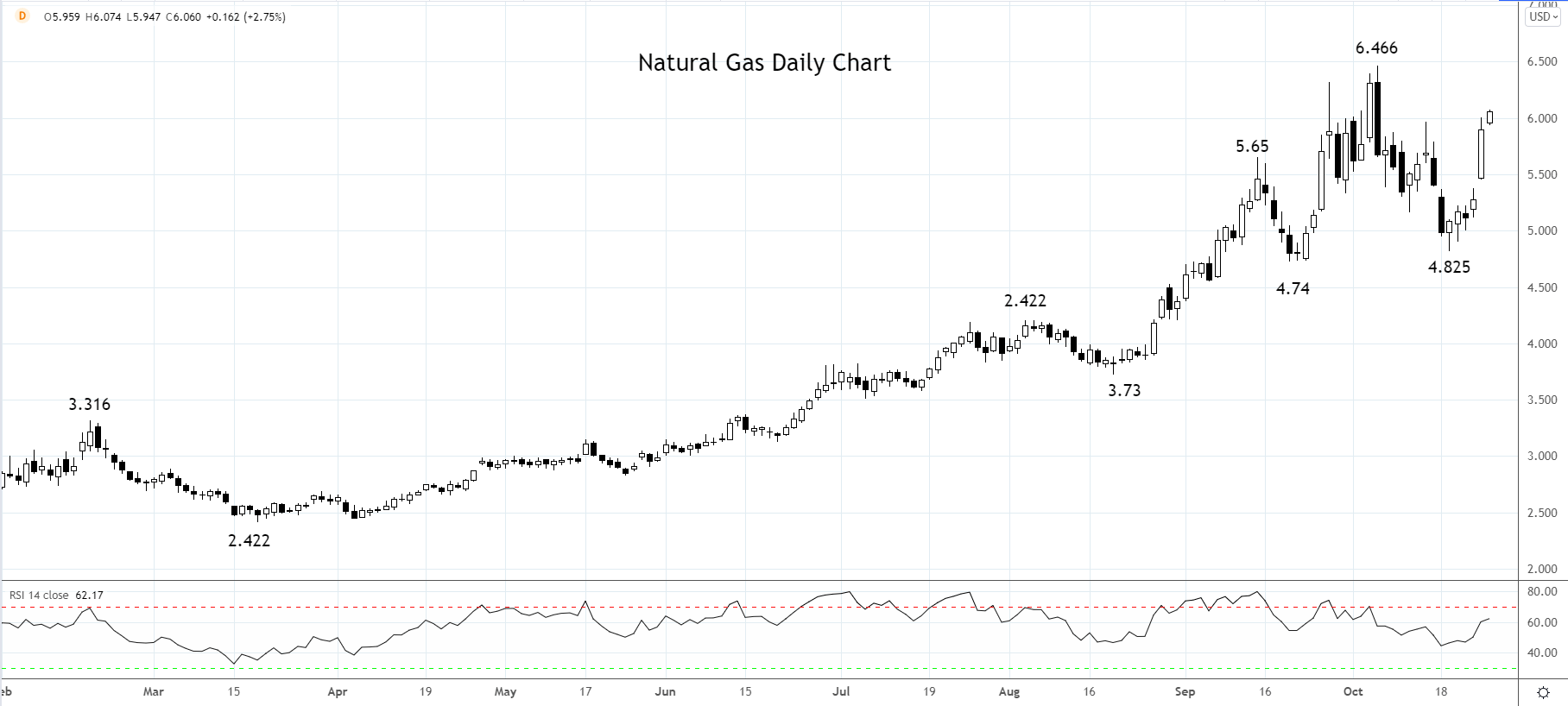 今天,天然气价格亚盘再度上涨了3%,达到6.08美元,该走势进一步佐证了自6.466美元高点至4.825美元低点的回调只是牛市中的一次调整。