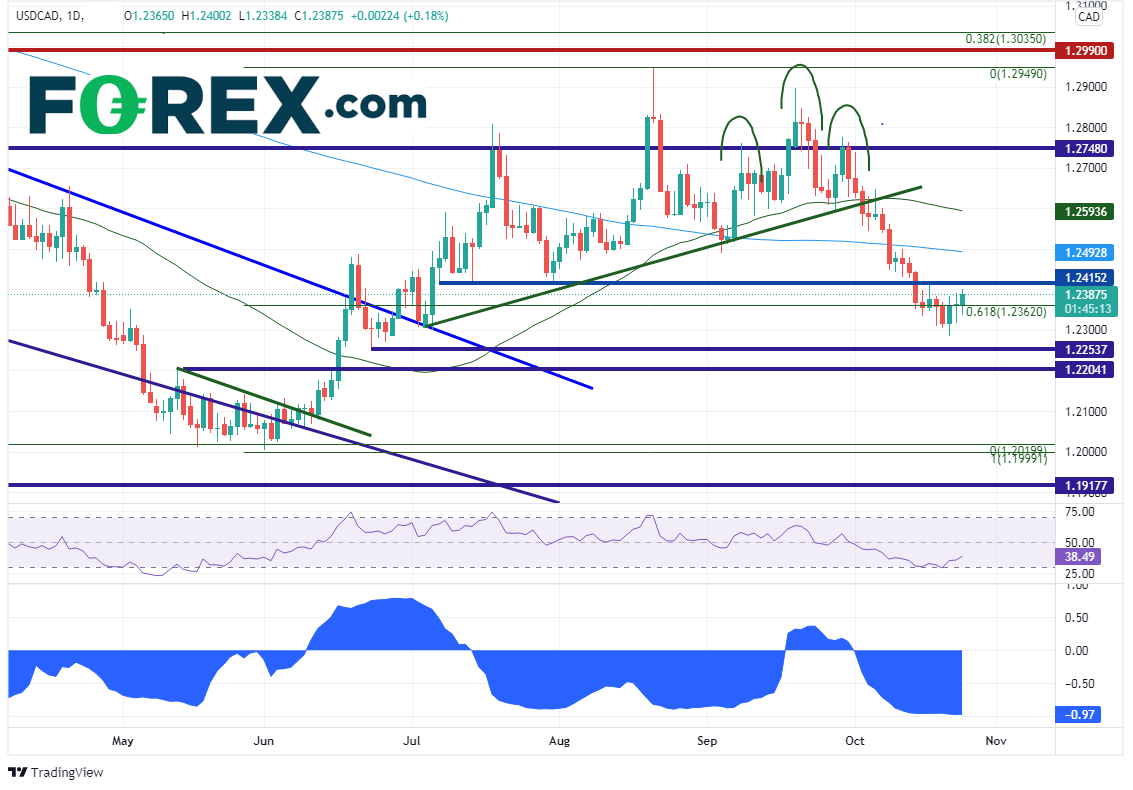 自从10月4日打破50天移动均线和头肩顶形态的颈线后,美元/加元不断走低,触及6月1日低点到8月20日高点行情的61.8%回档位,即1.2362附近之后于10月14日止跌。从那之后一直交投于1.2288-1.2410区间。下图底部的美元/加元和原油之间的相关系数显示,目前报在-0.97。-1.00表明完全负相关,-0.97已非常接近。所以,如果油价延续长期上涨势头,则美元/加元有可能重拾跌势。