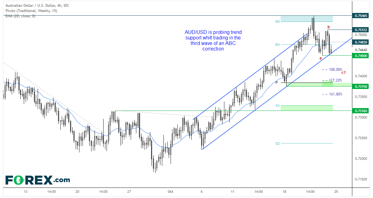 澳元/美元震荡下破0.7550,目前探入趋势支撑,处于ABC修正形态的第3浪,如果发生“等波浪长度”的行情(即浪A的长度=浪B的长度),则有可能跌至0.7415。如果扩大下行,可能跌至月图枢轴点附近。