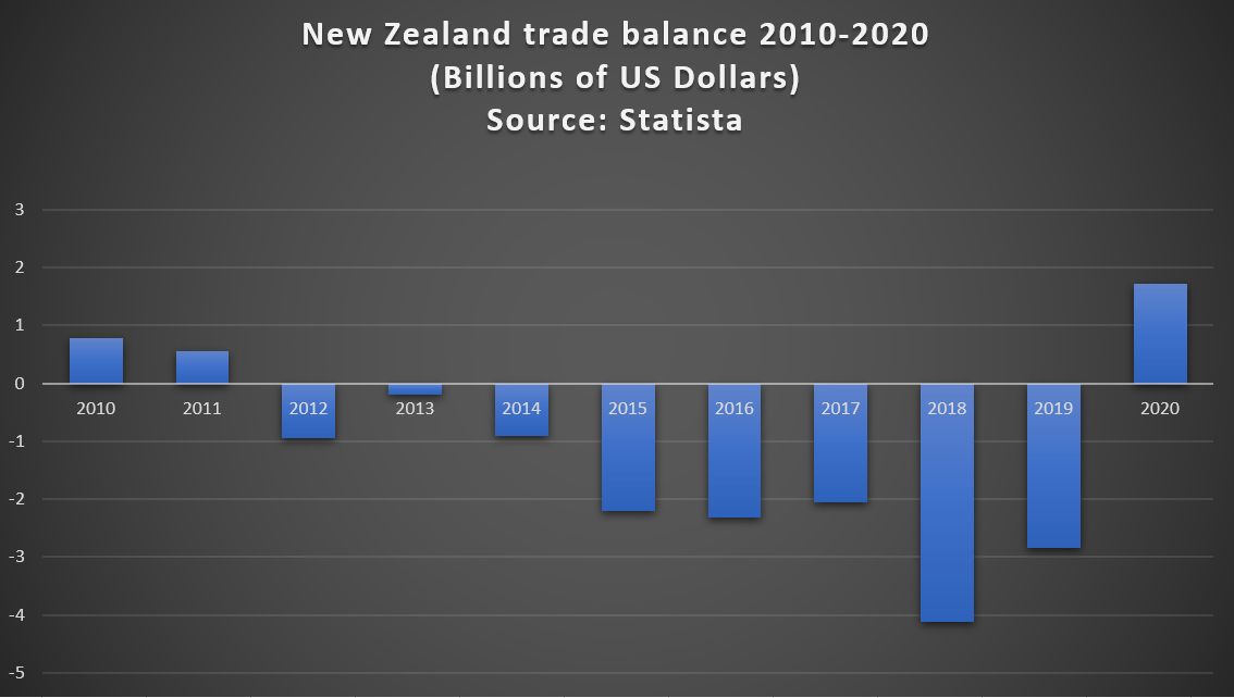 到了21世纪,新西兰已经实现了经济的多元化,发展了旅游业。根据Statista的数据,如今旅游业占该国GDP的5.5%左右。新西兰贸易帐也在2020实现2011年以来首次贸易顺差。