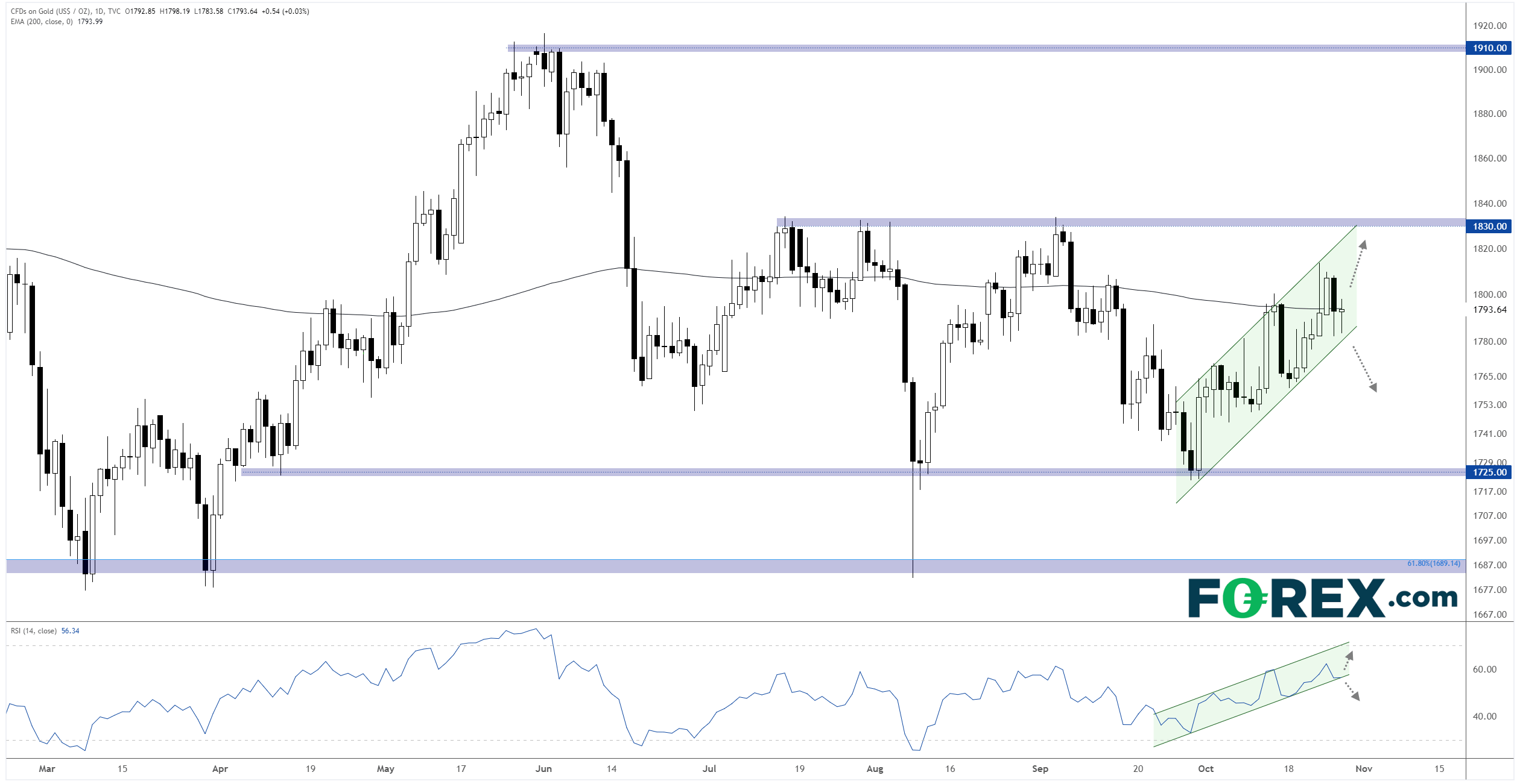 技术面看,黄金自从9月底在1725支撑位附近筑底以来一直在一个短期上涨通道内走高,只不过本周迄今走平: