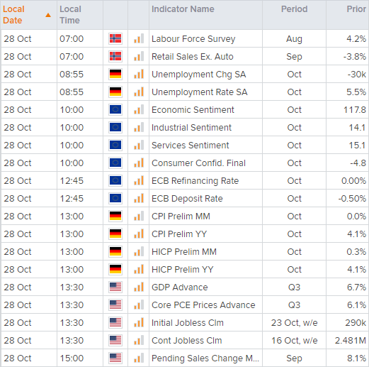 美国GDP初值也将在英国夏令时13点30分发布,同时揭晓的还有失业金申领数据。鉴于“重新开放”早已不是新鲜话题,且供应链瓶颈依然顽固存在,大多数人预计第三季度增长将会放缓。但如果数据特别疲软,那将在一定程度上削弱复苏势头,不过如果这样的话,我们将对美联储下次会议上宣布缩表存疑。但这可能有助于提振欧元/美元。