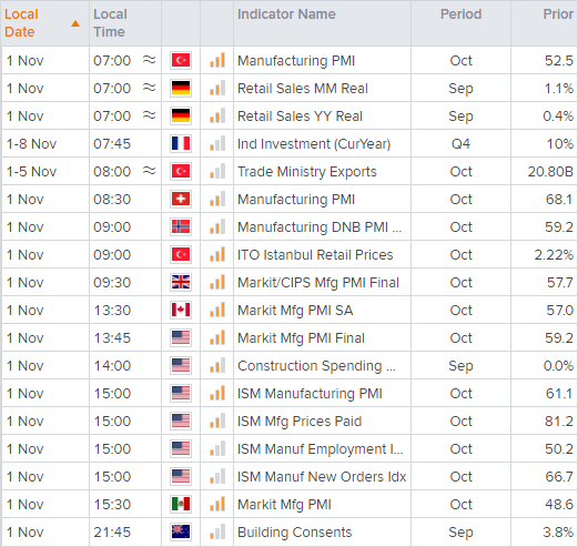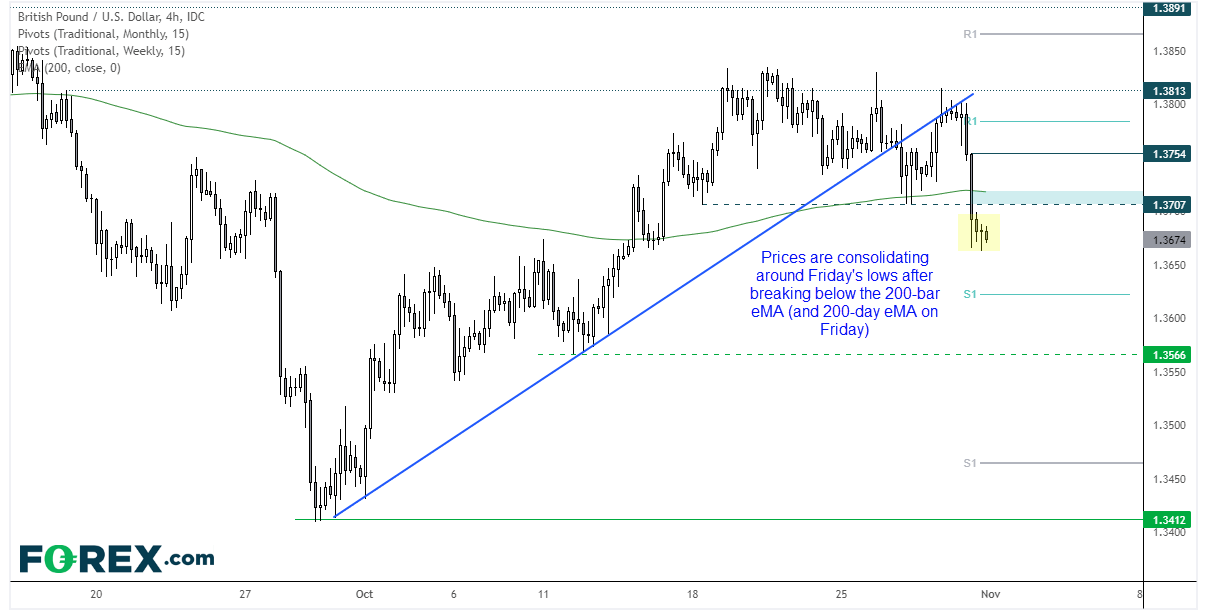 鉴于周五的K线形态,我们要么于周五区间内寻求看跌,要么等待汇价下破周五低点以延续看跌。我们可以在四小时图上看到,汇价于已破趋势线受阻后,看跌动能成为主导。200K均线落在10月27日低点附近,所以若小幅回调进入该区域,或引发做空兴趣。