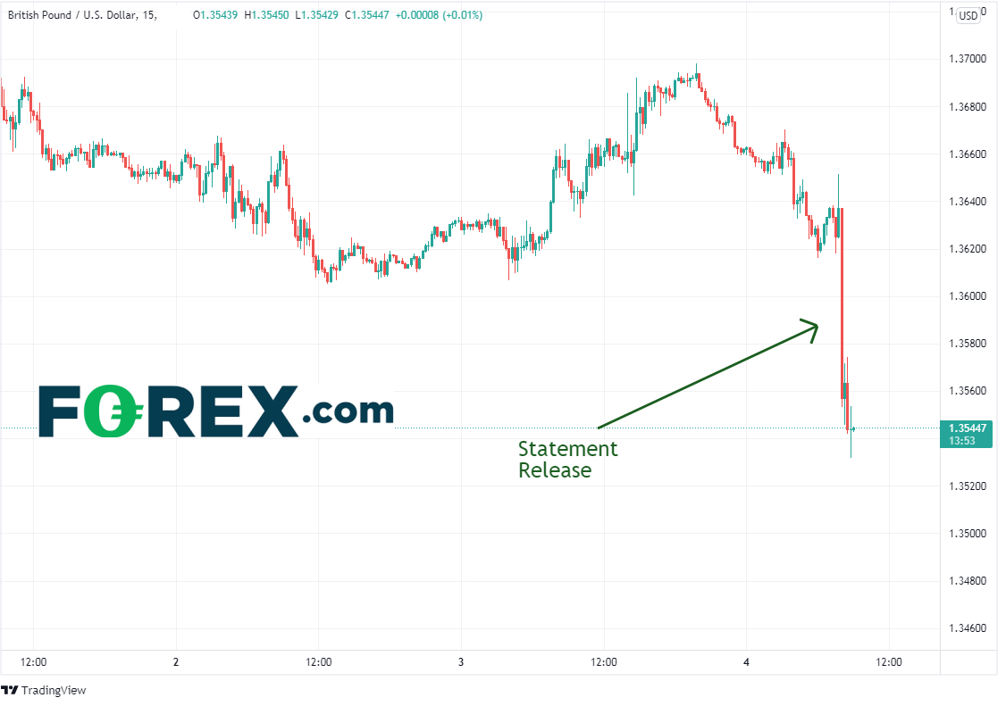 英镑/美元在上述声明发布后旋即自1.3637暴跌至1.3554,周四迄今最低跌至1.3521,跌幅超过1.1%。