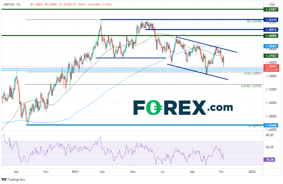 英镑/美元日图从10月29日开始切实走低,当天受到月末美元买盘的冲击,下跌之前曾上攻7月29日以来下斜趋势线所在的1.3800附近阻力。该货币对周四无力站上50天均线1.3702后跌至略高于水平支撑位所在的1.3519处,该位之下是一个支撑带,由2020年9月23日低点到2021年6月1日高点行情的50%回档位所在的1.3459和9月29日低点所在的1.3411构成。阻力位在前述50天均线、下斜趋势线(仍落在1.3800附近)、200天均线1.3846(其曾在10月底挫败了反弹企图)。