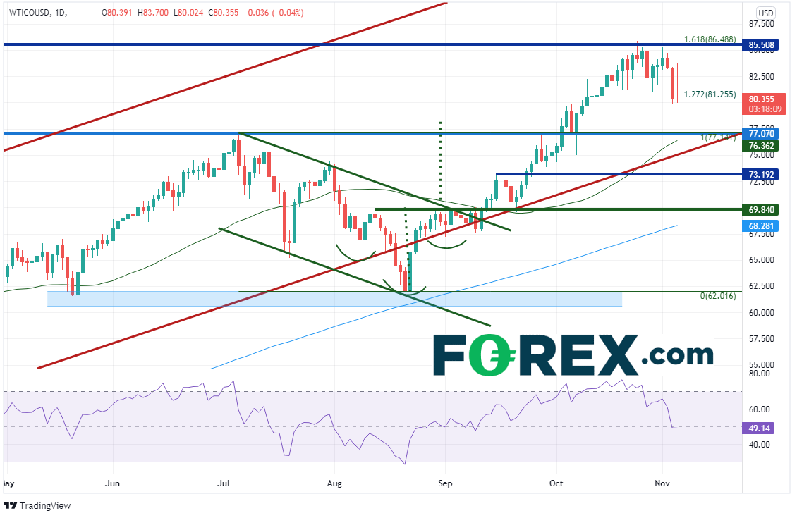 自从2020年4月暴跌以来,西得州油价一直得到买盘青睐,在8月形成头肩底形态且在9月10日站上69.84的颈线所在。西得州油价快速击穿该形态目标78.00,后于10月25日止步于由水平阻力位和7月6日高点到8月23日低点行情的161.8%扩展位相汇而成的85.50/86.50区域附近。在今天OPEC+会议召开之前当然涌现了获利回吐盘。