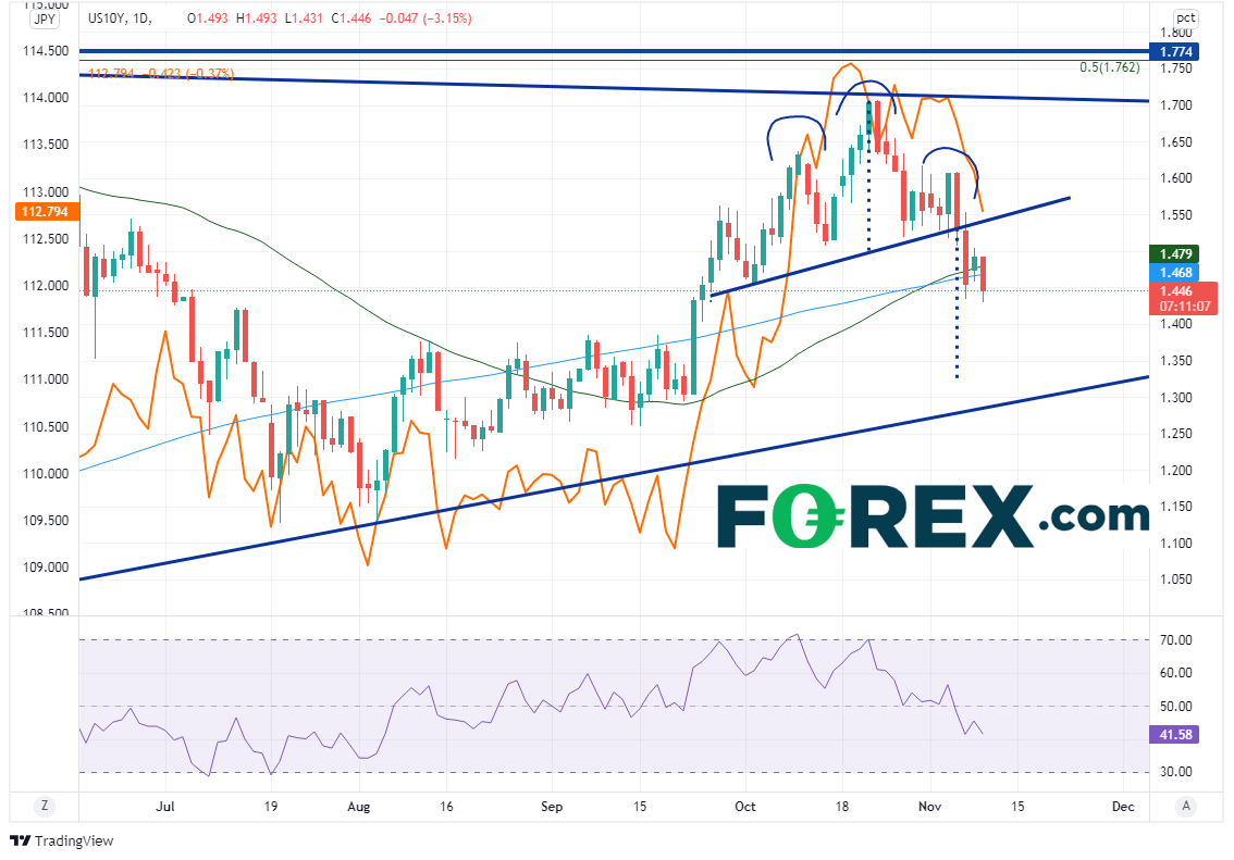 我们经常说美国10年期国债收益率与美元/日元通常同时波动。下图是美国10年期国债收益率图表,上面的橙色线是美元/日元的价格走势,我们可以轻松地看到两者是如何互动的。收益率在10月21日到达近期高点1.704%,随后因11月3日FOMC会议逼近而回撤至头肩顶形态的颈线,即1.55%附近。10年期美债收益率在11月4日突破前述颈线,下探1.33%的目标。请注意,收益率在周二既击破50天均线,也攻克200天均线,两者分别落在1.479%和1.468%。如果收于其下,可能利空美债收益率,亦不利于美元/日元。支撑位在1.378%和上斜趋势线1.29%。