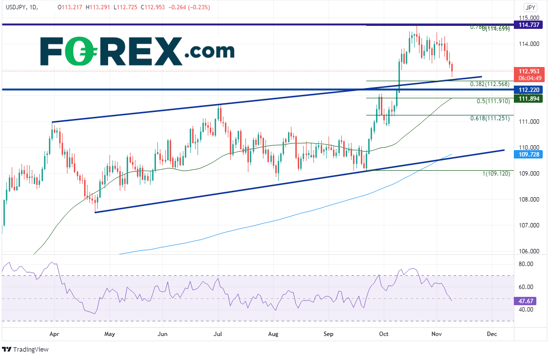 这就引人思考“美元/日元可能走向何方”的问题?9月FOMC会议以来,美元/日元脱离通道支撑位109.12后不断走高,于10月20日创下114.70高点,那是2017年以来的阻力位。美元/日元在走高的途中攻克水平阻力位兼通道上轨趋势线112.22附近,使其现在转变为支撑位。但该位之上是通道上轨趋势线兼9月22日低点到10月20日高点行情的38.2%回档位,即112.57附近。112.22下方是又一支撑带,由50%回档位和50天均线构成,落在111.90附近。短线阻力位在周二高点(兼10月28日低点)113.29,如果站于其上,价格有望摸至10月20日高点114.74。