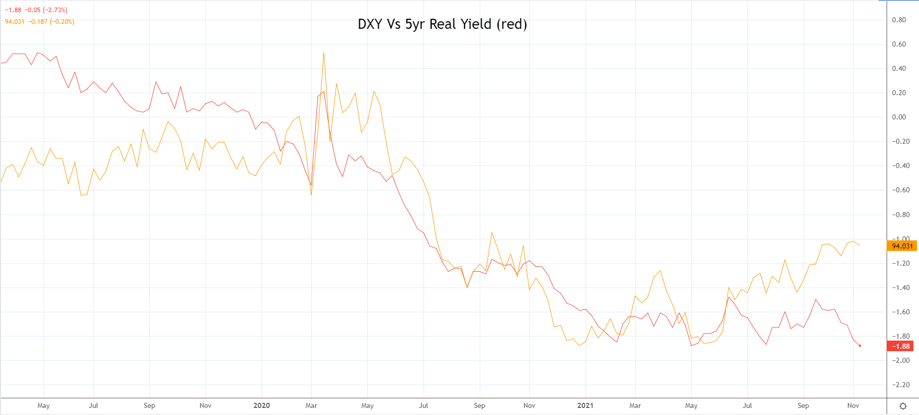 除黄金外,收益率下降也有可能影响外汇市场。从下方美元指数图表可以看出,美元指数与实际收益率走势密切相关。指数目前交投于94.00,看起来高估了近2%。