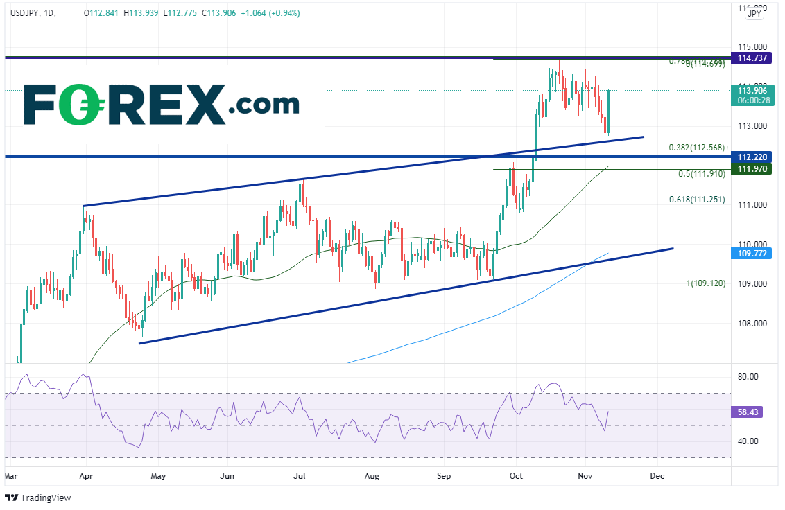 黄金上涨的同时美元/日元和美元指数也走高:这完全符合通胀读数高于预期下对市场可能走势的期待。美元/日元从我们周二讨论过的支撑位反弹,即上升趋势线兼9月2日低点到10月20日高点行情的38.2%回档位附近。下个阻力在10月20日高点114.75。
