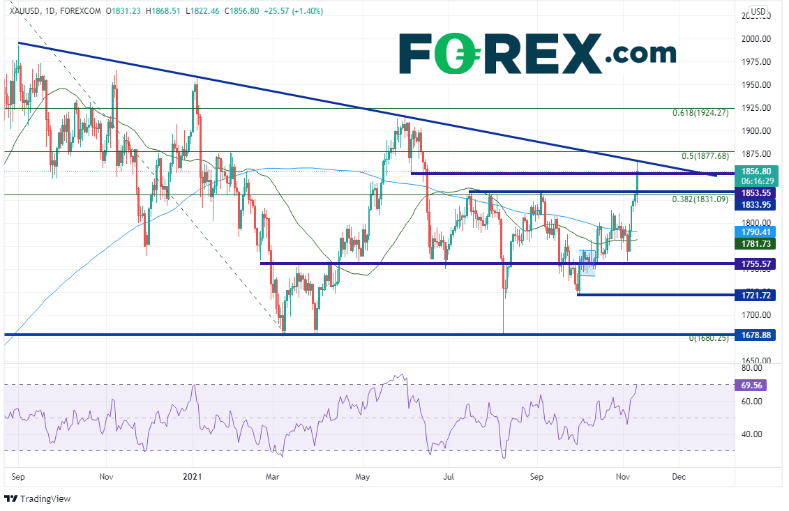 过去4天黄金(现货黄金/美元)不断走高,在CPI数据发布后进一步冲高,击穿前高点和2020年8月高点到2021年8月低点行情的38.2%回档位,摸至6月17日以来最高点,还攻克前低点1853.55。接下来的阻力在2020年9月1日以来下斜趋势线1869附近,然后是前述行情的50%回档位所在的1877.68。