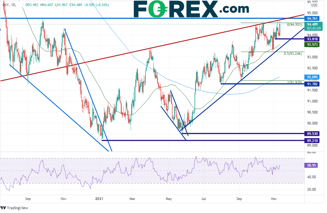 美元指数同样在测试年内新高。11月5日以来的前高点在94.62,周三迄今高点在94.60,上方不远处即为2011年以来上斜趋势线(红色线),即94.70附近构成的阻力,紧接着就是去年9月以来的水平阻力位94.76。下方第一个支撑位在11月2日低点93.18,然后是50天均线所在的93.57,接着是上斜趋势线、10月28日低点和9月3日低点到10月12日高点行情的50%回档位相汇而成的93.25。