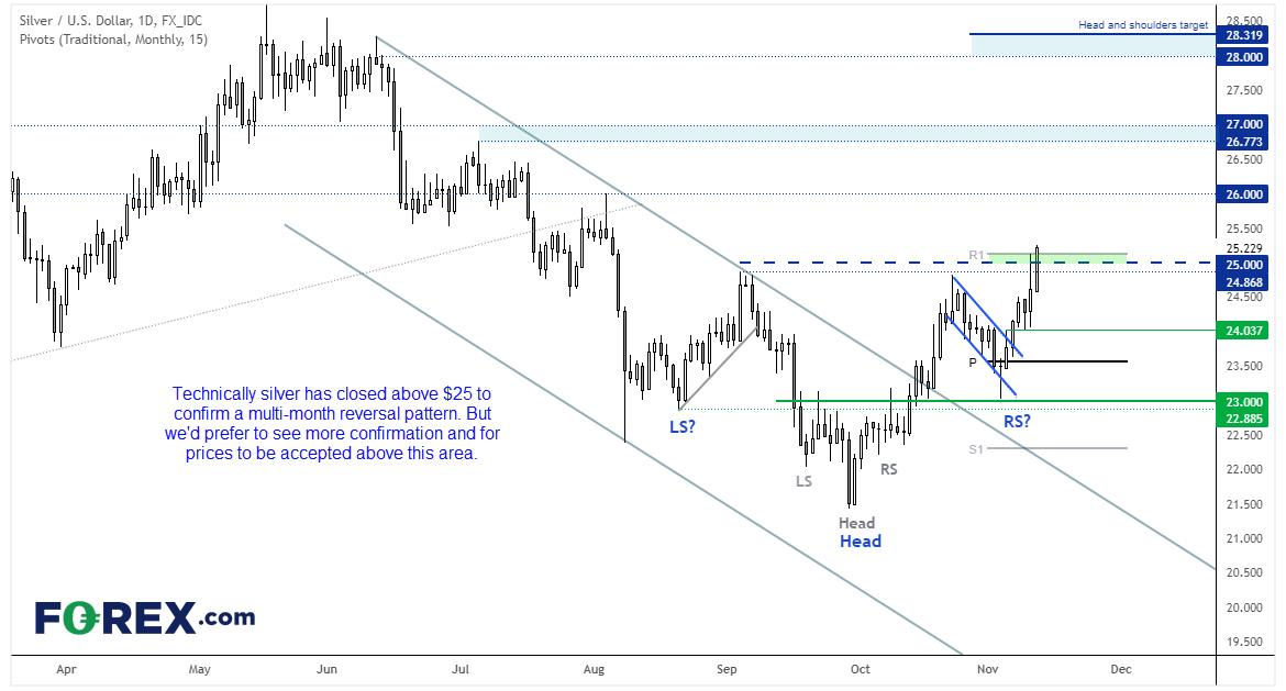 白银价格8月以来首次收上25,现在从技术面验证了头肩底形态的有效性。该形态突破后的测量目标在28上方,但鉴于其可能持续数月,我们应该保持耐心。我们也需要银价斩获一次超过23美分的突破以确认正处于较长期反转行情中。所以,无论从哪个方面看银价都值得关注。