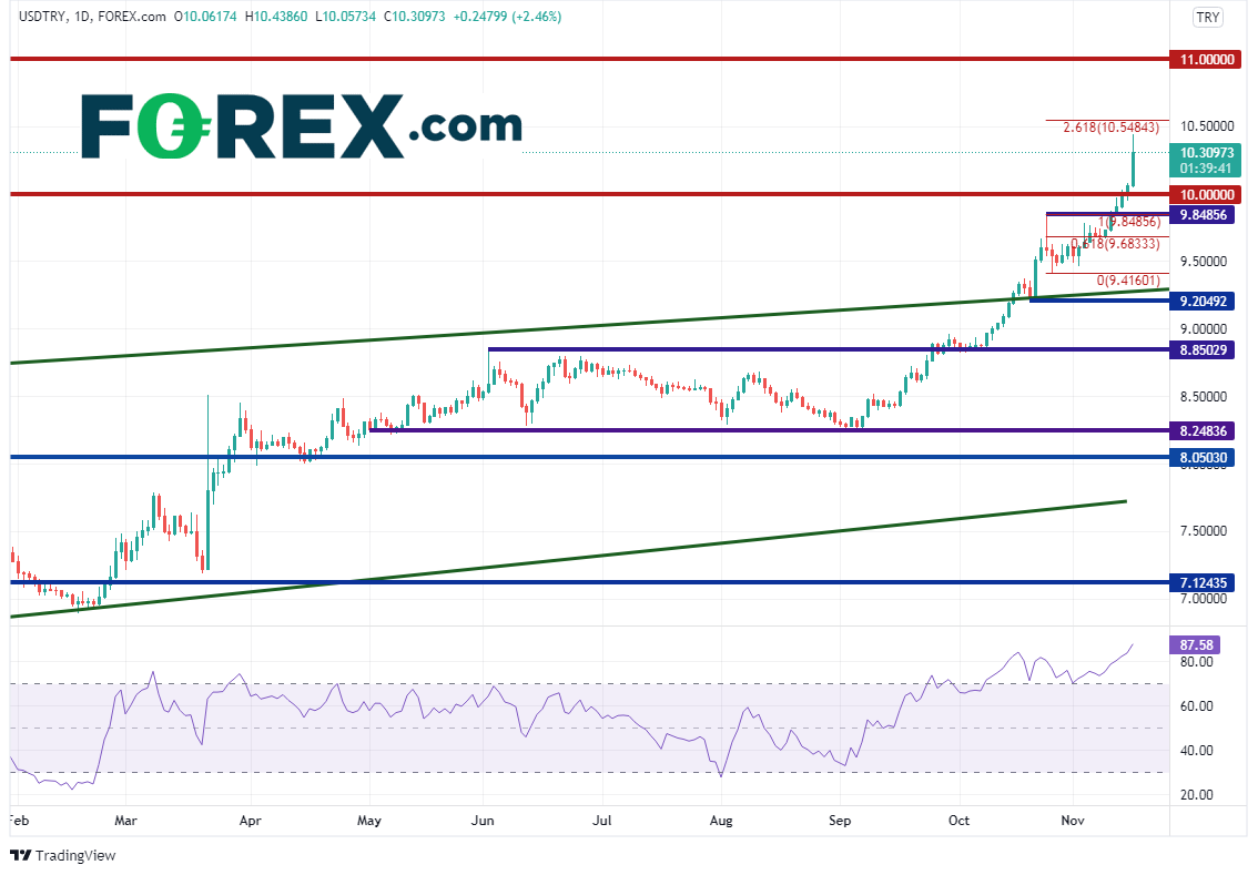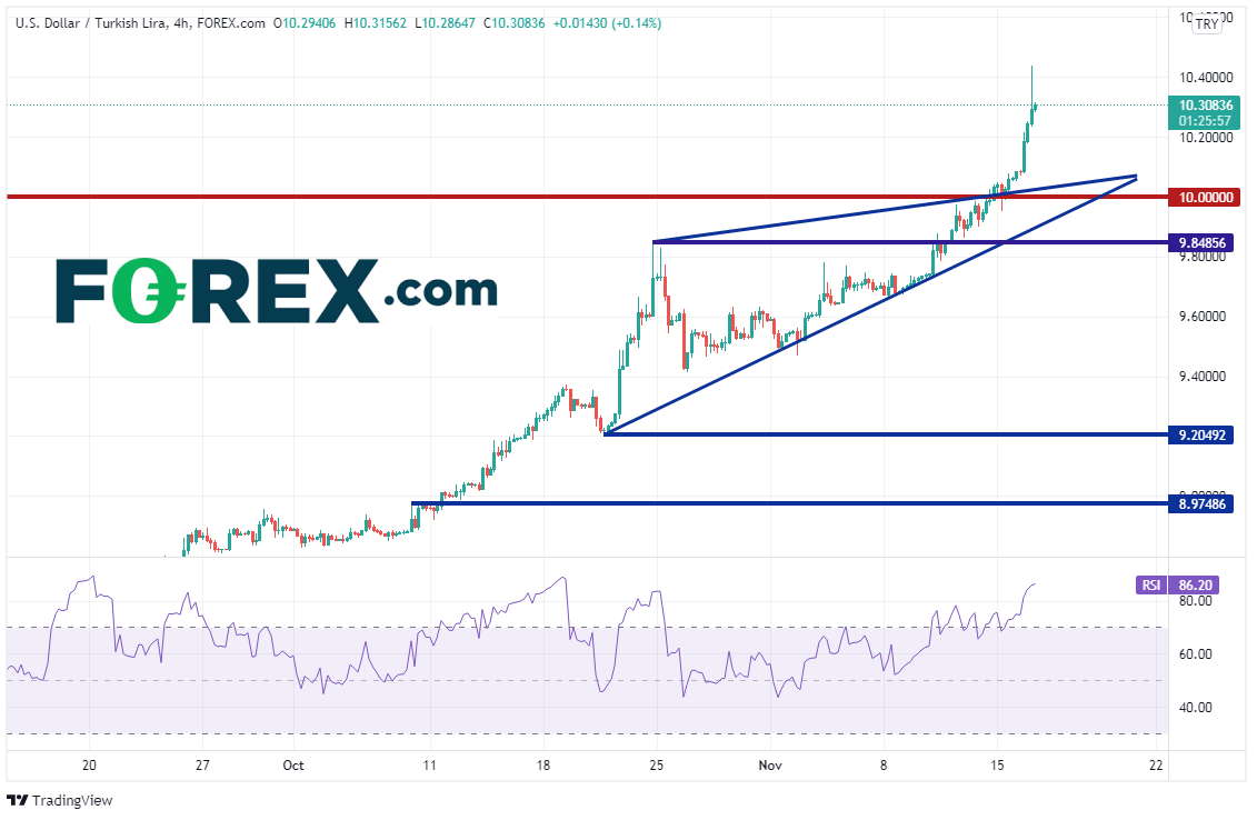 美元/土耳其里拉周一击穿10.00,周二大举上攻,摸至10.4386,接近3.8%的日图波动区间高点。自从9月7日触及8.2718之后,美元/土耳其里拉高歌猛进,涨逾26%。这种一开始看似由全球通胀上涨引发的走势已变成土耳其总统Erdogan个人的奇观。Erdogan曾表示,不希望土耳其央行加息,尽管最新的10月通胀年率高达19.89%,其中贡献最大的是食品价格的上涨。Erdogan甚至解雇那些反对降息的央行行长,代之以愿意降息的人选。所以,土耳其央行在上次会议上降息200个基点,将基准利率从18%下调至16%,幅度远高于市场预期的50个基点。在土耳其高通胀和降息以及美国通胀(上涨但涨幅为远低于预期的6.2%)和美联储处于缩表/“很快加息”模式的联袂作用下,美元/土耳其里拉每日都创下新高。
