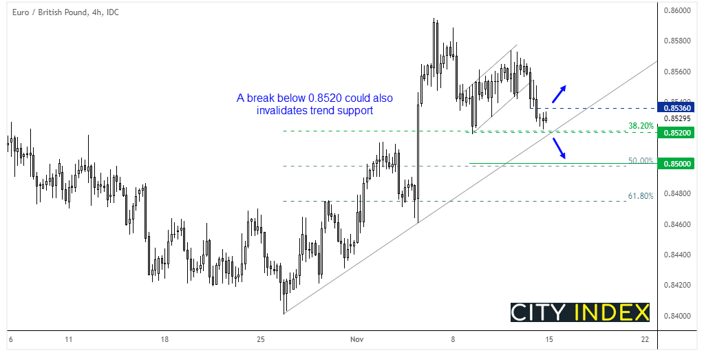 在欧盟表示愿意就北岛问题寻求切实可行的解决方案后,英镑处境有所改善。英镑/美元收复周四大部失地,并在隔夜试图升穿3日高点。周五,欧元/英镑承压下挫约0.35%,重新测试(并可能跌破)0.8500的可能性升温。