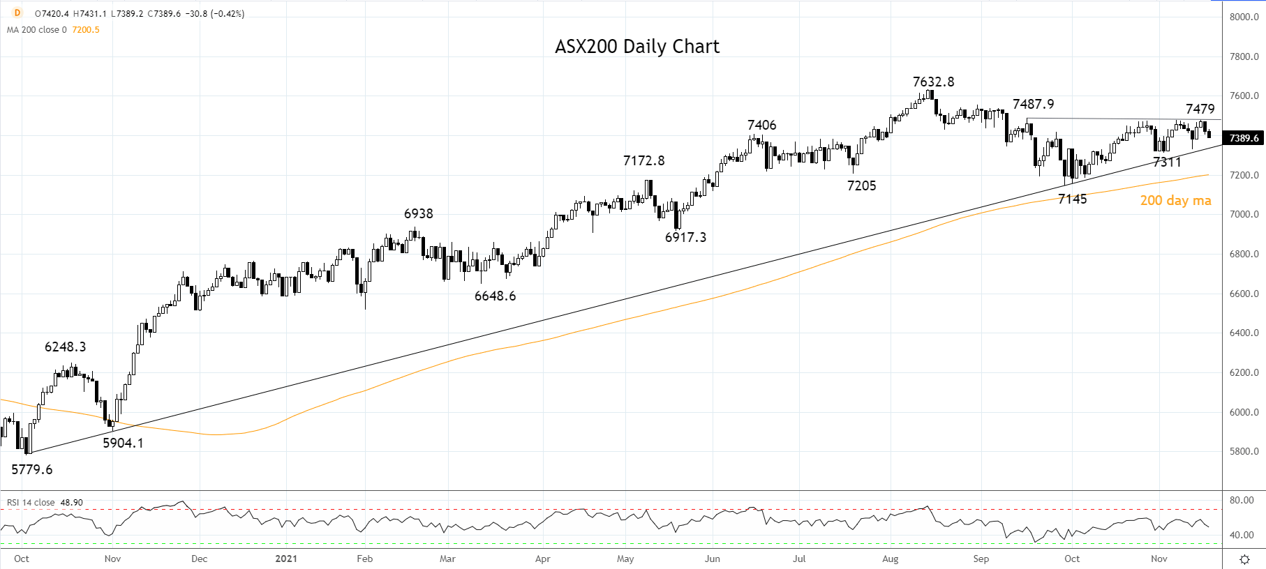 如下图显示,ASX200指数近期受制于7480/88水平,此处似乎是一个坚不可破的阻力层。下档来看,股指支撑落在2020年10月5779低点以来上升趋势支撑位7330,然后是11月初低点7311。