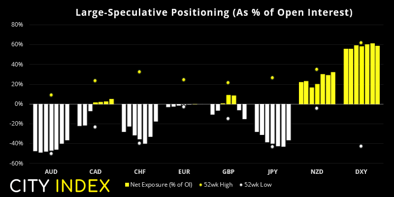 - 大型投机者现正大举做空英镑期货,净空头敞口目前处于2020年6月以来最看跌水平。