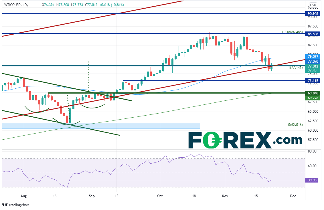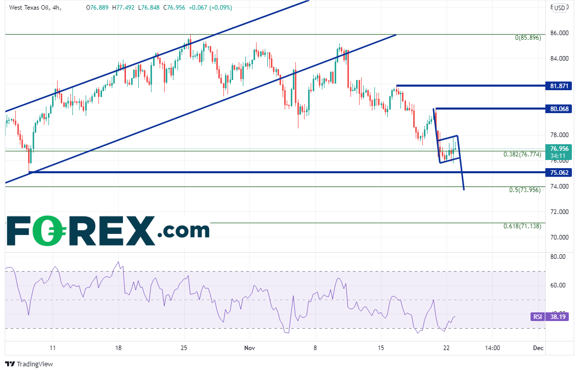 自11月10日形成看跌吞噬K线以来,西得州原油从85.15不断走低,于本周一触及75.77低点。