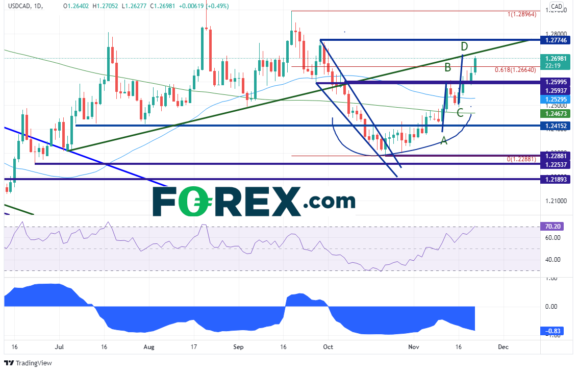 西得州原油和美元/加元之间的相关系数目前为-0.83,正如我们常说的,两者之间存在负相关联系。读数低于-0.80被视为强负相关。美元/加元日图击穿9月20日高点到10月21日低点行情的61.8%回档位1.2664后摸至AB=CD形态的目标1.2710附近,另外,该货币对止步于7月5日以来的上斜趋势线。
