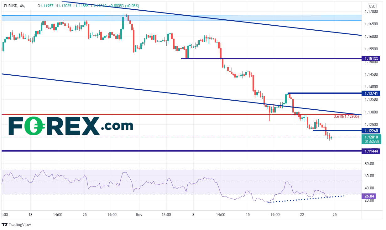 结合美联储官员们近期的强硬评论,以及偏强硬的FOMC 11月3日会议的记录,欧元/美元走低也在情理之中。毕竟,欧洲央行的很多评论截然相反。欧元/美元4小时图最近击穿了2020年3月低点到2021年1月高点行情的61.8%回档位,攻克了5月底以来的下降通道的下轨趋势线,接下来的目标在遥远的3月30日高点1.1145引出的水平支撑位。但请注意,欧元/美元价格目前与RSI背离,表明价格有准备回升的可能性。在周四和周五流动性不足的美国市场,这种可能性显得尤其真实。水平阻力位在1.2260,然后是前述通道的下降趋势线,即1.1300附近,接着是11月18日高点1.1374。