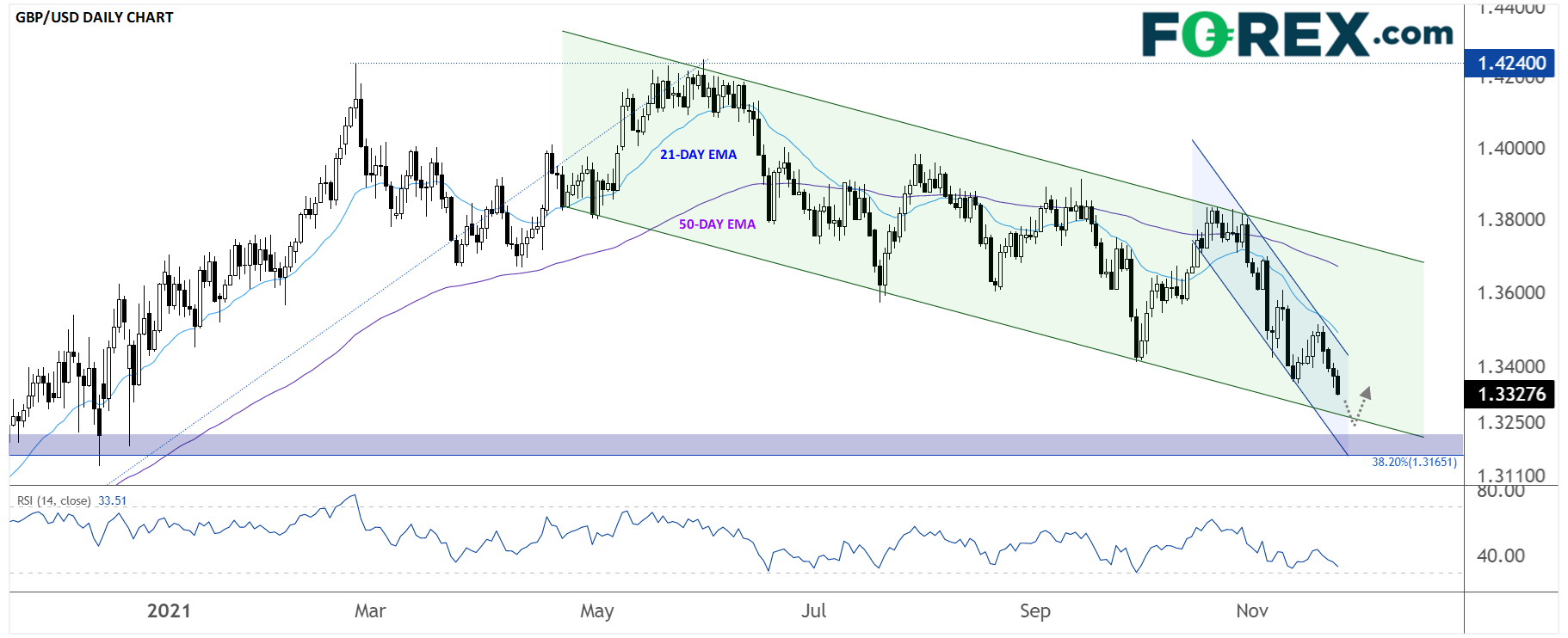 美元兑所有主要对手货币今天迄今如上所述正在上涨,但其中更值得关注的是英镑/美元。英镑6个多月里一直交投于较大的下跌通道内,过去一个月更是形成下斜程度扩大的下跌通道。此文发稿时英镑/英镑于1.3300一线下轨创下年内新低,而下档支撑在遥远的1.3200一线下轨,在那里2020年四季度低点与疫情后期的整个反弹行情的38.2%回档位相交于1.3200一线。