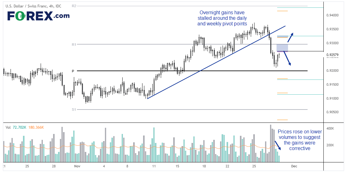 美元/瑞郎上周五形成稳定的看跌吞噬K线,但目前已收复当天失地的三分之一左右。4小时图形成了早晨之星形态,短期或扩大修正行情,斩获更多涨幅。但请注意,周图和日图枢轴在0.9270附近,可能为看跌波段交易者所用。而如果价格站上该位,或确认新一轮涨势。需要监测的阻力包括0.9300和0.9320,支撑位在0.9200和0.9167。