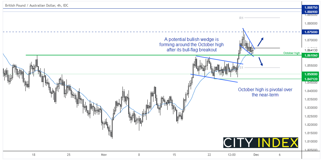 在达成我们的1.8750目标价格之后,汇价现已回落至10月高点这个不错的潜在支撑水平。考虑到四小时图表潜在看涨楔形,只有当前价位看涨动能爆发,才能说明货币对已重拾看涨趋势。