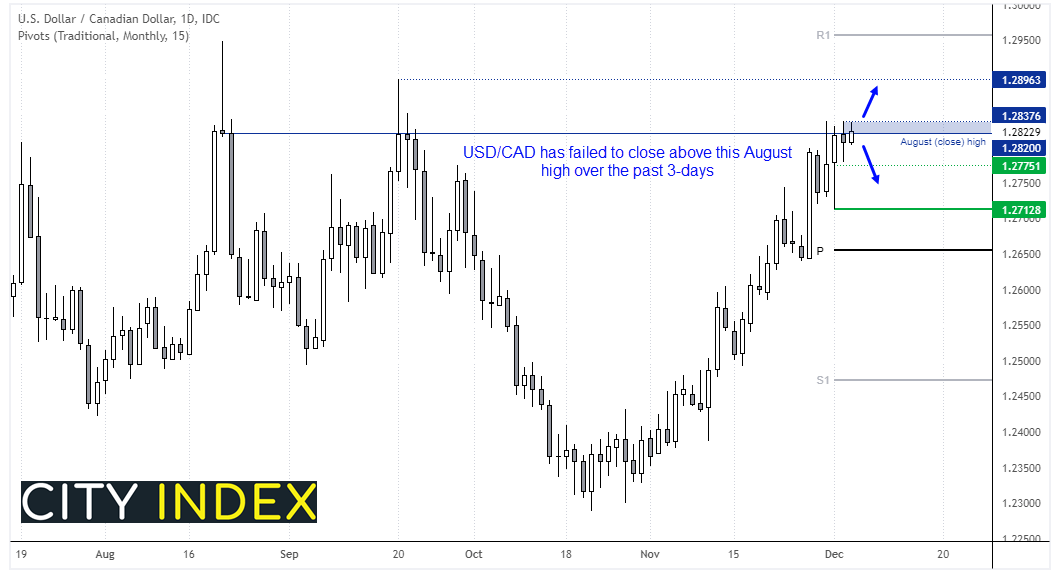 从峰值到低谷,WTI已自10月高点下跌了约23%。但昨天日线图于高于平均水平的成交量下构筑看涨锤子线,且低点守在8月低点之上。因此,我们猜测价格是时候自当前水平反弹了。